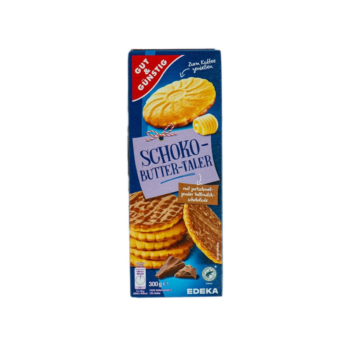 Ciastka G&G Schoko Butter Taler to klasyczne maślane ciastka o wyraźnie kruchej strukturze, wzbogacone dodatkiem czekolady. Charakterystyczna formuła talarków oraz wysoka zawartość masła sprawiają, że ciasteczka mają intensywny, pełny smak i delikatną konsystencję.