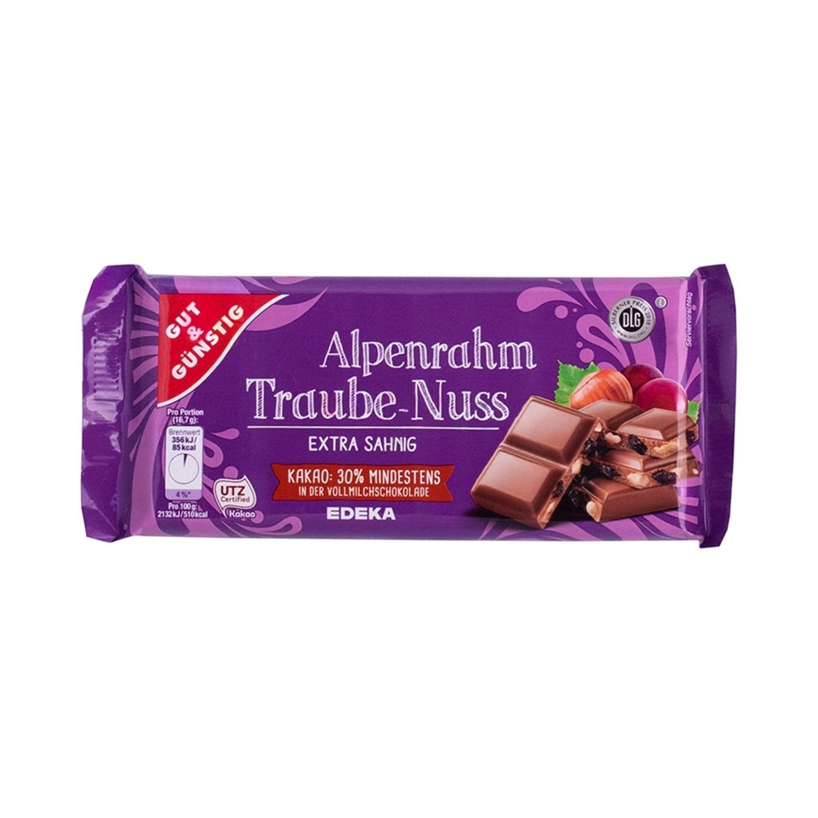 Czekolada G&G Traube Nuss to ponadczasowa kompozycja, która łączy słodycz soczystych rodzynek z chrupkością siekanych orzechów laskowych. Całość zamknięta jest w delikatnej, mlecznej czekoladzie, tworząc produkt o bogatej teksturze. To idealny wybór dla osób, które lubią, gdy w czekoladzie „coś się dzieje” – połączenie miękkich owoców i twardych orzechów nigdy się nie nudzi.