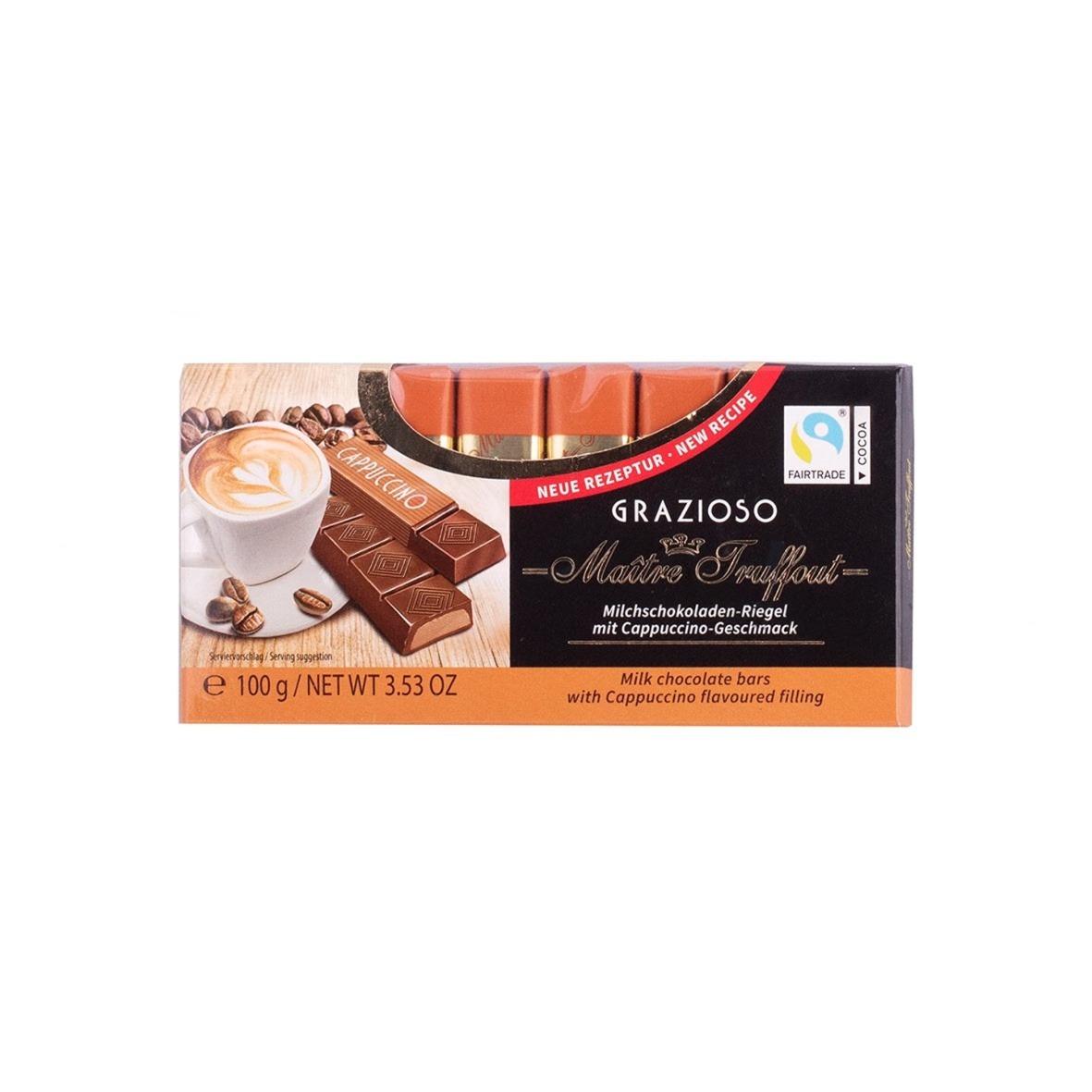 Czekoladki Maitre Truffout Cappuccino to kwintesencja łagodności zamknięta w mlecznej czekoladzie. Nadzienie tych batoników zostało zainspirowane kultową kawą z puszystą pianką, co nadaje im lekki, mleczno-kawowy profil. To idealny wybór dla osób, które wolą delikatniejsze, bardziej aksamitne nuty niż w przypadku mocnego espresso.