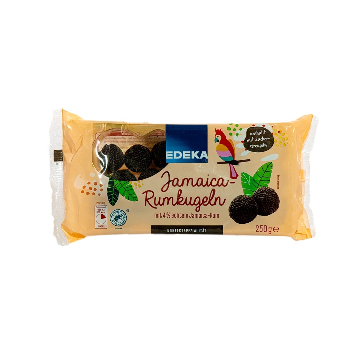 Skład: masa kakaowa z rumem (cukier, syrop glukozowy, kakao niskotłuszczowe, tłuszcz palmowy, rum 4%, mielone migdały, miazga kakaowa, masło kakaowe, substancja utrzymująca wilgoć: inwertaza; stabilizator: agar-agar; emulgator: lecytyny), posypki cukrowe (cukier, niskotłuszczowy zagęszczacz: guma arabska, tłuszcz palmowy).